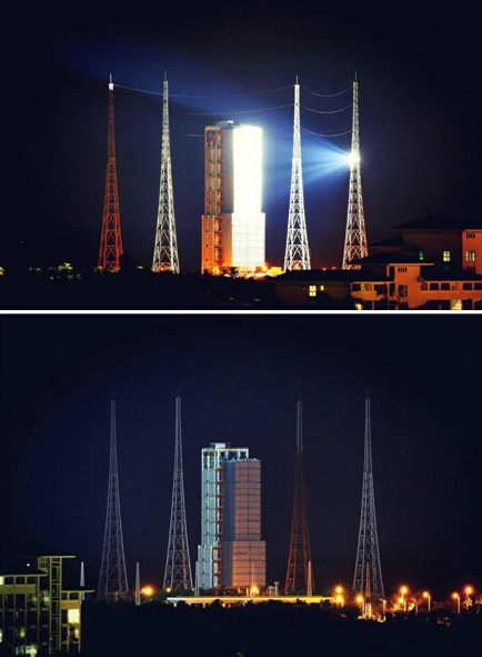 夜幕下的发射场区,海风轻拂,椰林婆娑,灯火通明。