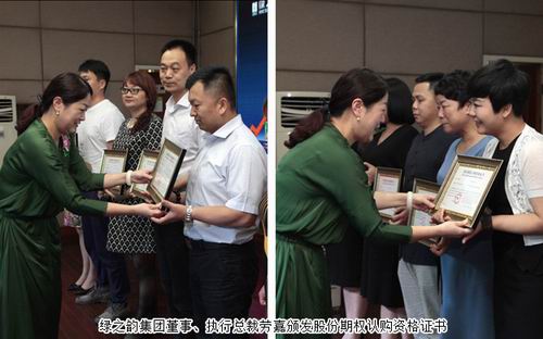 本次活动最引人注目的当属股份期权资格颁授环节。在全场目光聚焦中,绿之韵集团董事、执行总裁劳嘉为第二批获得股份期权认购资格的事业伙伴颁发了认购证书。优秀市场精英代表毛远立、宋会萍作感恩分享,赢得了家人们阵阵掌声。
