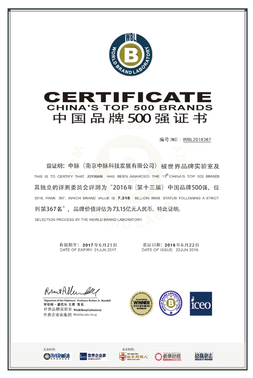 近日,由世界品牌实验室(World Brand Lab)主办的“世界品牌大会”在北京举行,会上发布了2016年(第十三届)《中国500最具价值品牌》分析报告。在这份基于财务、消费者行为和品牌强度的监测报告中,中脉以73.15亿元的品牌价值进入“中国500强最具价值品牌”第367位,这也是中脉连续13年入选“中国500强最具价值品牌”。