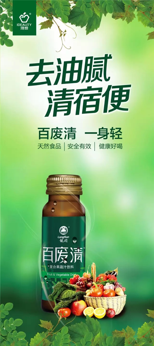 根据“茶生活方式是行为医学的践行者”的理念,理想经过3年的研发,从产品配方、理论体系、中医保健等方面进行了全面整理和调配,选用日常所见所用的果蔬,药食同源食材以及新资源食品及有益菌种,经过优化配比,打造出“百废清”这一款具有明显排毒作用的果蔬饮品。百废清采用中医理论中的“君臣佐使”和理想科技集团独创的“通解调补”理论,以辣木、青梅、决明子,促进肠道蠕动,改善胃肠功能,促进肠壁收缩,从而将毒素剥离;诺丽果、金银花以清解肠毒、血毒,从而将剥离后的毒素化解、中和、转化。以山药、麦芽、猴头菇、麦芽、山药、益生菌等调脾养胃;有益菌双向调节肠道菌群,加快肠道蠕动,促进粪便排出,解除便秘。用枸杞子、松茸,补充细胞能量,调理阴阳、脏腑、气血功能。达到润肠通便、解毒化积、调理肠道、补益调理相结合,达到排毒素、清宿便、养容颜、健身体的作用。天然果蔬与益生菌的巧妙组合,复合果蔬,健康好喝。