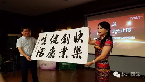 开业仪式结束后信阳市首次事业说明会在欧凯龙家居小镇二楼多功能会议室成功举办,并得到信阳欧凯龙全球家居中心的大力赞助支持,在市场骨干凡天兵、孙莹老师的真情分享后,乾坤国际决策委常委、信阳第一人雷涛先生详细讲解了康美中药全产业链,让更多家人们详细了解到中医药龙头企业的实力、品牌优势及商业模式,迎来现场观众的阵阵掌声,多位新朋友看好康美并选择了康美,最后中国著名书法家、河南省书法家协会理事杨旭老师心怀大爱倾情献艺,为形象店现场题写了”快乐创业健康生活、大爱无疆”等六代真传珍贵墨宝,并现场赠与旗舰店负责人杜丽女士收藏!