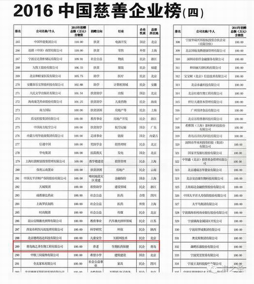 近日,2016(第十三届)中国慈善榜榜单公布,榜单分列慈善家榜单、慈善企业榜单及中国公益基金会榜单。其中在慈善企业榜单中 ,海之圣生物工程有限公司以100万元人民币的捐赠位列榜单第289位,荣光的背后,展现的是一家民企强烈担当的社会责任心。
