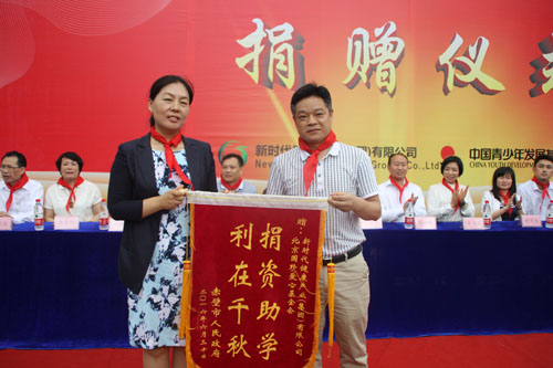 新店镇党委书记刘新洲代表当地政府讲话,他对新时代人的到来表示热烈欢迎,并对新时代人在扶贫及教育工作方面的贡献表示感谢。赤壁市新店镇镇长叶青松代表赤壁市政府感谢了公司对于当地教育事业的支持,并向公司授予锦旗,王宝玉总监代表公司接受了锦旗。