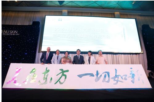 在活动现场,随着“美在东方、一切如新”八个字在“如新蓝”和“美谷紫”完美融合的彩色粉末中熠熠生辉, NU SKIN如新与东方美谷战略合作正式启动。据了解,“东方美谷”是一个以奉贤区全域为载体,以“美丽健康”概念相关的产品轴、服务轴、产业轴构成的多种产业共生共赢的“美丽健康产业联盟”。NU SKIN如新中国总裁暨大中华区域副总裁郑重先生表示,2016年是NU SKIN如新“升级年”,从品质、服务以及形象上使NU SKIN如新品牌更加年轻态,更有活力,进而推动业绩持续稳健成长,同时希望通过升级,作为美丽健康产业领军型企业和行业标杆,更好地对接东方美谷的发展战略实践,促进上海美丽健康产业的长远发展。
