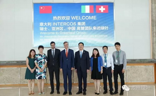 2016年7月11日,意大利INTERCOS集团亚太区总裁Martin Breuer先生,意大利INTERCOS集团瑞士CRB总经理Alessandro先生,莹特丽科技总经理王邑华女士一行来访绿叶集团洽谈合作。