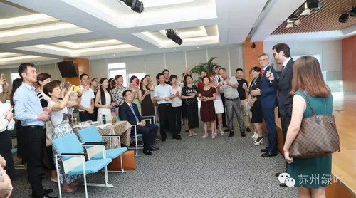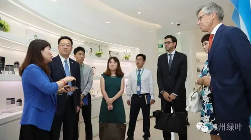 在绿叶集团董事兼执行总裁胡笑勃先生、高级副总裁韩静女士的陪同下, INTERCOS集团来访团参观了绿叶集团企业文化厅、产品展示厅和会议中心等处,Alessandro先生和Martin Breuer先生还饶有兴致地与绿叶精英做亲切交流互动并合影留念。