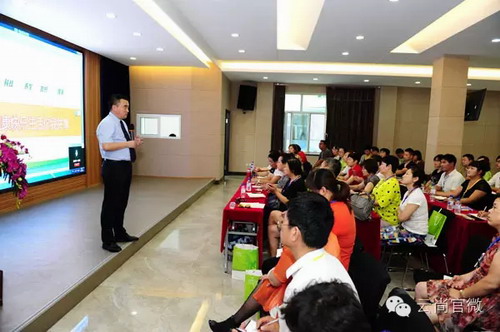 云尚商学院教育部经理郭延珠先生讲解吉林云尚产品与健康理念,台下店长们认真听取,不时爆出阵阵掌声。