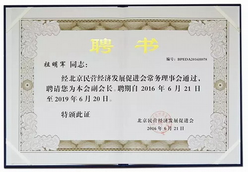 金天国际董事局主席祖明军被聘为“北京民营经济发展促进会副会长”