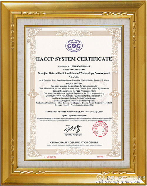 2016年6月6日-6月10日,中国质量认证中心(CQC)天津评审中心对权健集团HACCP危害分析和关键控制点体系进行了为期5天的现场审核,经过审核组严格认真细致的现场检查及文件记录的检查,2016年7月5日,权健集团顺利取得HACCP体系认证证书。