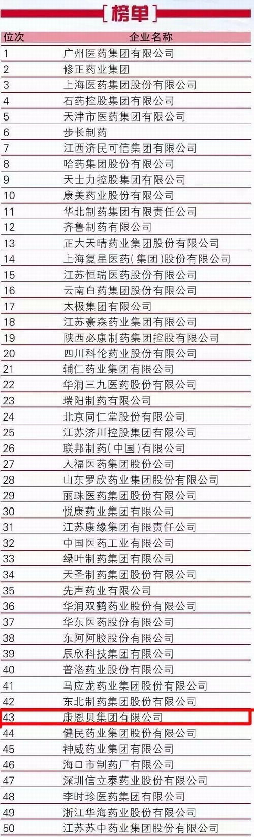 7月15日,由国家食品药品监督管理局南方医药经济研究所评选的“2015年度中国制药工业百强榜”发布。康恩贝上榜,位列第43位,这是康恩贝继2010年上榜后,连续第六年入围该榜单。