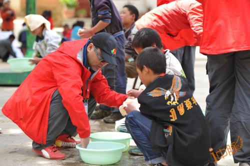 王健为云南省宁蒗县蜂子岩学校学生代表发放爱心粽