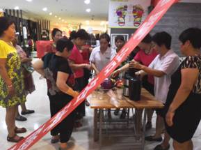 大家体验时可以慢走、可以小跑、也可以原地运动,同时我们现场还特别为大家准备了果汁。顾客可以一边体验魔力鞋神奇的效果,一边喝着果汁并听着萃取机产品的讲解获得养生知识,一举三得很是惬意。