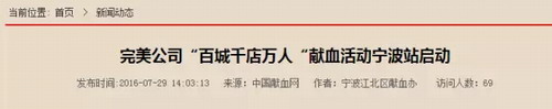 “完美公司百城千店万人献血活动”宁波站启动
