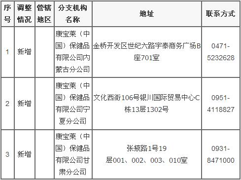 2016年8月2日,商务部直销行业管理信息系统网站公示康宝莱(中国)保健品有限公司调整直销产品信息。康宝莱此次新增内蒙古、宁夏、甘肃3家分支机构。详情如下: