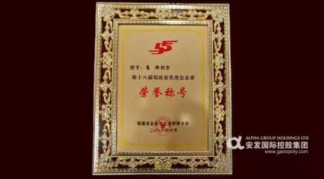 2016年8月3日,第十六届福建省优秀企业家表彰大会在福州召开。安发国际控股集团总裁高炜先生在本次大会上荣膺第十六届福建省优秀企业家称号。两年一次的“福建省优秀企业家”评选工作由福建省企业与企业家联合会组织举办。出席本次大会的有福建省委常委、常务副省长张志南,省企联会长李川、省企联执行副会长兼秘书长闻盛宣等领导。