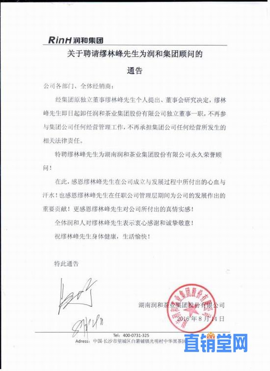 经集团原独立董事缪林峰先生个人提出、董事会研究决定,缪林峰先生即日起卸任润和茶业集团股份有限公司独立董事一职,不再参与集团公司任何经营管理工作,不再承担集团公司任何经营所发生的相关法律责任。