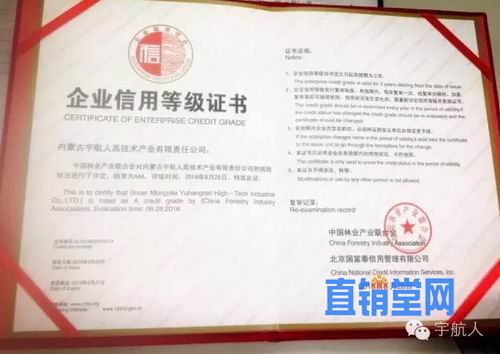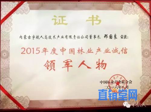 宇航人凭借多年的诚信经营和林产业方面突出贡献,荣膺首批AAA级《企业信用等级证书》,宇航人公司董事长邢国良先生因在推动我国林业产业发展中所做出的卓越贡献,荣获《2015年度中国林业产业诚信领军人物》奖。