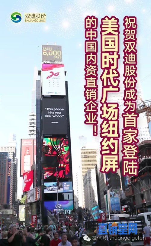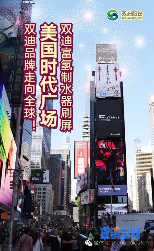 在举国欢庆中秋佳节和天宫二号成功发射之际,美国纽约当地时间9月16日上午,庆祝珍奥双迪事业20周年形象广告片亮相纽约时代广场大屏幕,双迪股份高调亮相全球中心——美国纽约时代广场最黄金的路透户外屏,成为第一家刷屏的中国内资直销企业。