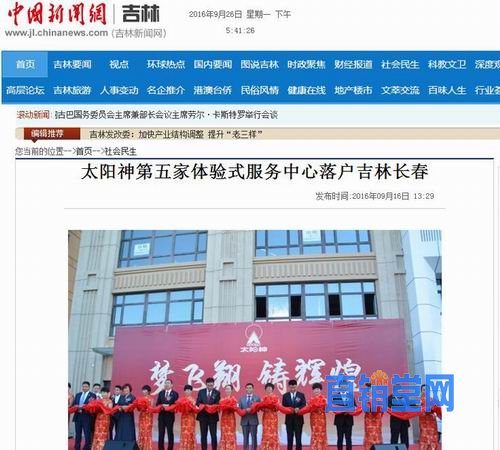 开业当天,中国新闻网就以《太阳神第五家体验式服务中心落户吉林长春》为题,从太阳神的发展规划,吉林形象体验中心落成对于东北市场及社会的意义,体验中心的具体功能和太阳神的事业优势等方面进行了详实的报道,并表示了充分的赞扬和肯定。