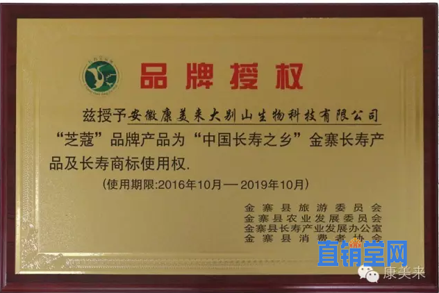 经过县旅游委员会、农业发展委员会、市场监督管理局和长寿产业发展办公室严格评选,并经县政府同意,授予安徽省康美来大别山生物科技有限公司“芝蔻”品牌产品为“中国长寿之乡”金寨长寿产品及长寿商标使用权。