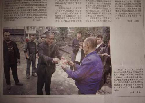 当得知八十多岁的老人常年无法下山时,刘董亲自来到山上老人的家中,与老人聊天,并把慰问金送到老人手中。遵义日报对安然的大爱行动进行了报道。