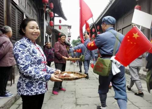 安然大军穿着红军服,排成长长的红军队伍,穿越了土城城区。土城百姓手持鸡蛋、花生、红薯等夹道欢迎安然大军,重现了当年人民欢迎红军队伍的热烈场景。热闹的充满喜感的扭秧歌,让整个活动更加其乐融融。