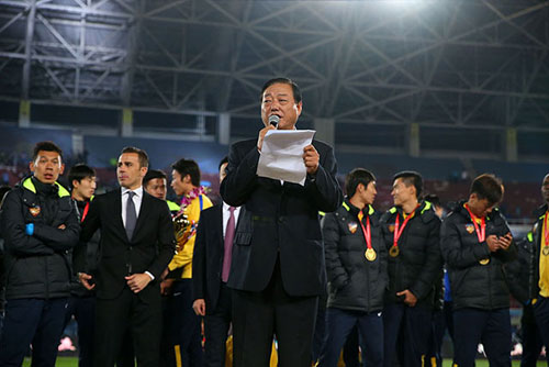 权健集团董事长、天津权健足球俱乐部总经理束昱辉发表讲话