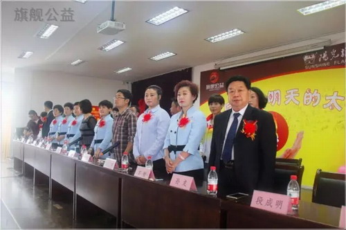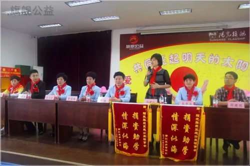 为表示谢意,马校长代表校方为旗舰公益献上了”捐资助学,情深似海”锦旗,在大家热烈的掌声中孟理事长与马校长共同为康婷阳光旗舰启智圆梦公益学校授牌。