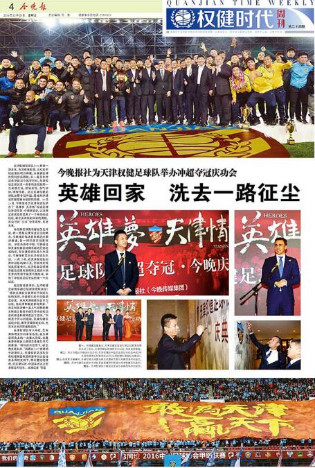 2016年10月28日,《今晚报•权健时代周刊》整版报道《今晚报社为天津权健足球队举办冲超夺冠庆功会》。