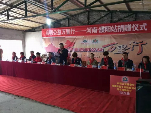 唐为民表示,今天启明公益基金会为我们子岸镇李沟村育苗小学带来了10万元的图书和400多个书包。这为我们学校播下了一颗爱心的种子,点亮了一盏爱心的启明灯。我衷心希望各位老师们、同学们,以书为伴,以书为友,敬岗爱业,勤奋学习,发挥好图书的引导、教育作用,共同营造飘着书香的校园,以优异的成绩向关心、支持教育工作的爱心人士交一份满意的答卷。