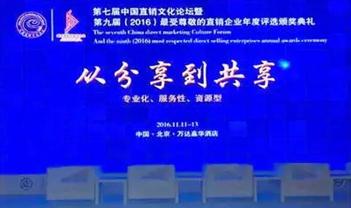 2016年11月11日,“第七届中国直销文化论坛”暨第九届(2016)最受尊敬的直销企业年度评选颁奖典礼”在北京隆重召开,在“让直销走向主流”的会议宗旨下,本次会议以“从分享到共享”为主题进行充分的文化探讨。