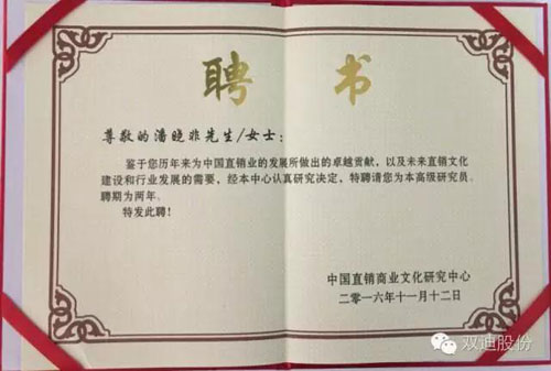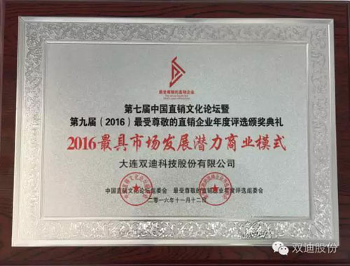 会上,五大系列奖项分别颁发给获奖者。鉴于双迪股份历年来为中国直销业的发展所做出的贡献和2015—2016年度的实际成绩,为树立典范,表彰先进,经网上调查投票、各地经销商推荐和组委会专家评审委员会审核,授予双迪股份“2016最具市场发展潜力商业模式”。同时鉴于董事长兼总裁潘晓非历年来为中国直销业的发展所做出的卓越贡献,以及未来直销文化建设和行业发展的需要,经中国直销商业文化研究中心决定,特聘潘晓非为高级研究员。