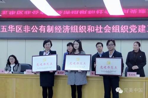 近日,“五华区非公有制经济组织及社会组织党建工作推进会”在昆明市五华区行政中心召开。会上,完美云南分公司党支部等3家单位被中共五华区委组织部、五华区非公有制经济、社会组织工作委员会,授予全区“党建示范点”荣誉称号。