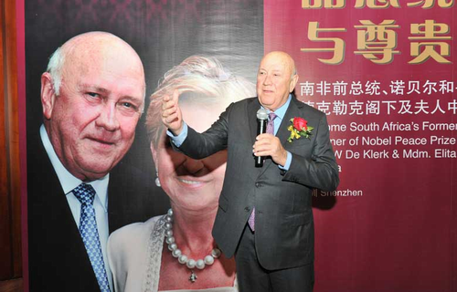 诺贝尔和平奖获得者、南非前总统德克勒克携夫人亲临宴会,与完美人同品佳酿,共享荣耀盛宴。南非驻上海总领事陶博闻夫妇、原中国驻马来西亚大使柴玺夫妇、总统联合会秘书长陈南谕、完美公司总裁胡瑞连等嘉宾,与完美经销商共聚尊贵高雅之夜。