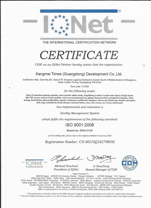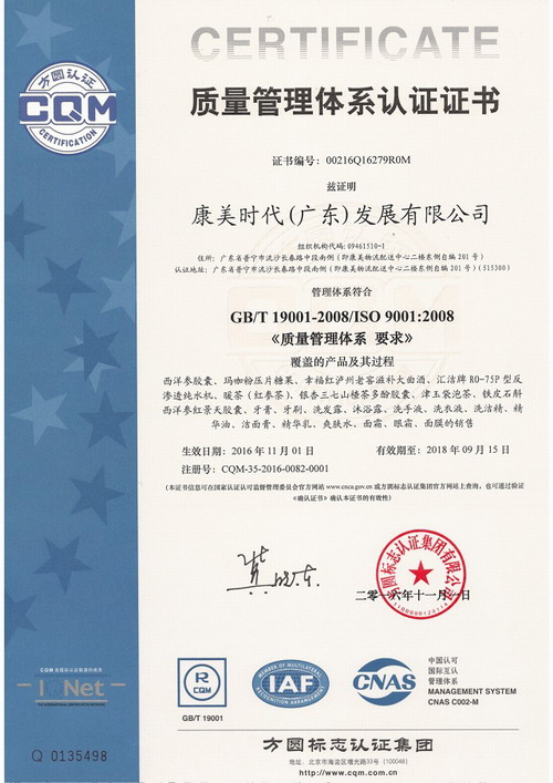 认证的通过,表明康美时代在各项管理系统整合上已达到国际标准,它可以站在顾客的角度,以顾客的需求为中心,持续稳定地向顾客提供满意的合格产品与服务。