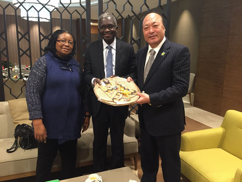 李金元董事长向Simon Pierre ADOVELANDE大使一行贵宾赠送了天狮集团的RichyOne皮包、老子像等礼品,并与大使先生等亲切合影留念。为了感谢李金元董事长和天狮集团为推动贝宁经济发展,增进中贝两国人民友谊所做出的贡献, Simon Pierre ADOVELANDE大使特意向李金元董事长回赠了寓意感恩的贝宁特色礼物。