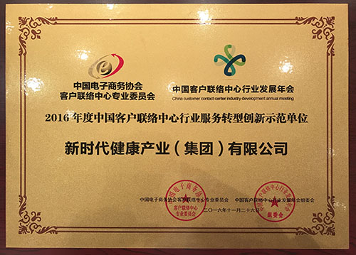 2016年11月26日,以“转型 创新 共赢”为主题的2016年中国客户联络中心行业发展论坛暨优秀单位颁奖晚会在中国大饭店举行。根据2016年中国客户联络中心行业优秀单位申报评选要求,经初审、现场入户测评、第三方机构调研以及新华网公众投票平台数据,经评审委员会最终审核通过,新时代健康产业集团客服中心被授予“2016年度中国客户联络中心行业服务转型创新示范单位”称号。
