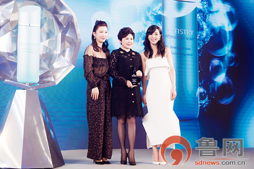 安利大中华市场副总裁余放女士上台领奖发言。嘉人出版人张晓冬女士以及知名影星张静初上台为雅姿颁奖