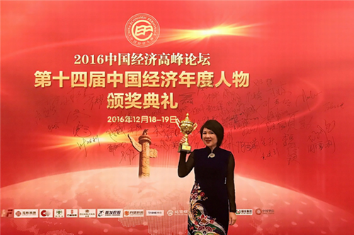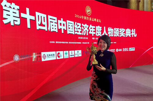 胡静女士手捧“2016 中国经济十大商业领袖”奖杯留影