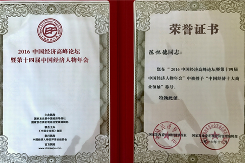论坛期间嘉宾、专家学者和企业领袖都进行了良性互动,同期发布了中国经济年度人物大奖。评审委员会认为:连续八届荣膺“中国十大慈善家”、中国扶贫开发协会副会长、全国工商联美容化妆品业商会副会长、民建中央对外联络部副部长、广东省第十二届人大代表、富佑集团董事局主席陈怀德先生锐意创新,业绩卓著,是“工匠精神”和“中国梦”的践行者,是中国经济发展进程中涌现出来的先进典型,荣获“2016 中国经济十大商业领袖”年度大奖实致名归。