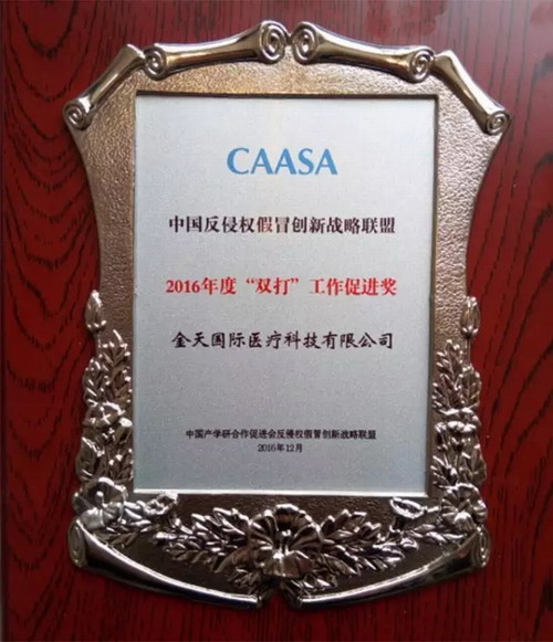 2016年12月20日,国务院“双反”创新战略联盟2016年度年会在北京举行,中国知识产权研究会理事长、国家知识产权局顾问原局长田力普,全国打击侵权假冒工作领导小组办公室张晶处长等领导出席,金天国际董事局主席祖明军作为中国“双反”创新战略联盟副理事长受邀参加,在本次年会上,中国双反联盟授予金天国际“2016年度‘双打’工作促进奖”。