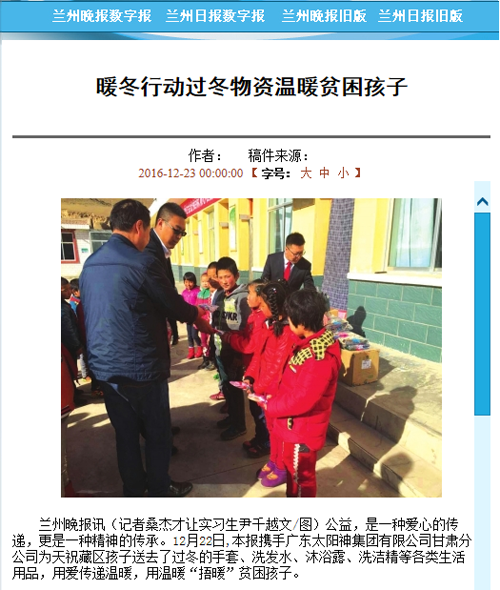 为此,《兰州日报》以《暖冬行动过冬物资温暖贫困孩子》为题,详实报道了太阳神积极捐献让孩子温暖过冬的爱心事迹,并对太阳神爱心行为给予了高度的肯定和赞许。