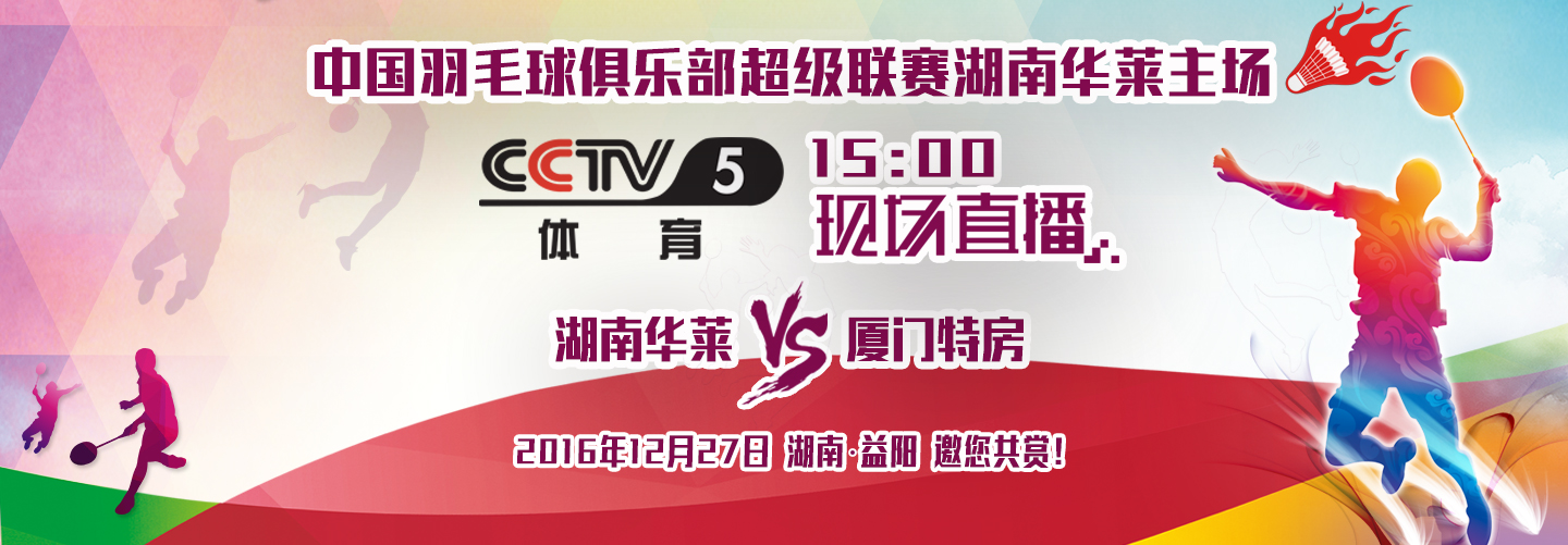 另外,12月27日下午3点,中国羽毛球俱乐部超级联赛湖南华莱主场将对战厦门特房,届时CCTV-5将对本场大战进行现场直播。让我们共同为湖南华莱队摇旗呐喊,也预祝湖南华莱队能再创佳绩!