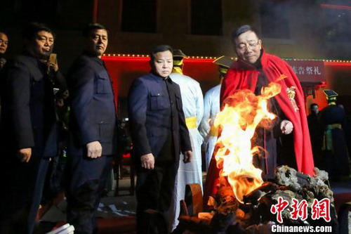 国家级非物质文化遗产东阿阿胶制作技艺代表性传承人秦玉峰点燃桑木火,开启又一年的九朝贡胶开炼仪式