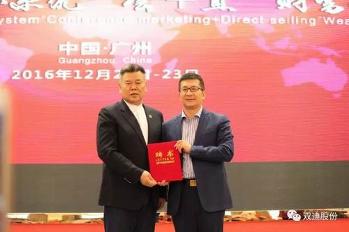 珍奥双迪事业创办人、荣誉董事长陈玉松为香港百岁天下国际集团有限公司董事长陈玉国颁发双迪股份兆和系统华南大区总裁聘书。