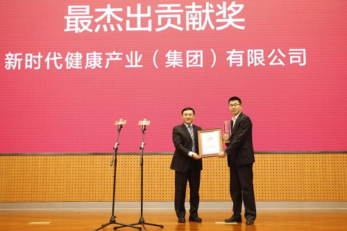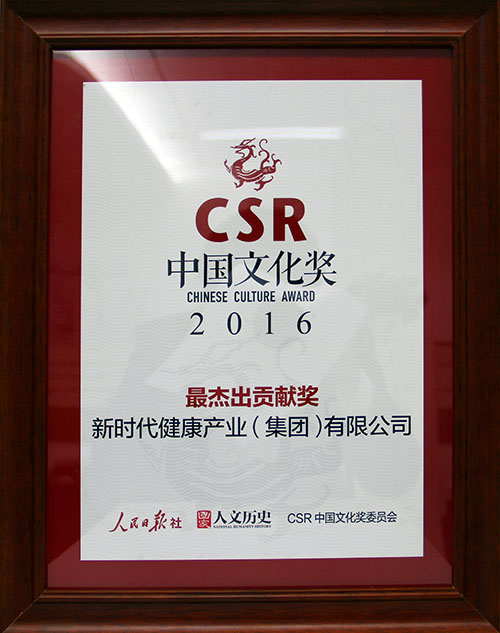 当日颁奖典礼上,新时代健康产业集团、北京梅赛德斯—奔驰、德力西电气、北京卫视等16家单位分获8项大奖,新时代健康产业集团摘得分量最重的“最杰出贡献奖”。组委会颁奖词指出,“新时代健康产业集团秉承‘自立立他 德行天下’的核心价值观和‘关爱健康 奉献社会’的社会责任理念,把‘弘扬传统文化,构建精神家园’作为企业的重要责任,积极承担‘十二五’教育部规划课题的研究工作,以文化扶贫的方式,面向青海省湟中县的中小学校推广弘扬中华优秀传统文化。公司出资近70万元用于课题研究,为湟中县的18所学校捐赠国学经典教材近4万册,资助近1000名当地教师参加各类国家级、地方级培训,成果惠及当地22所学校的16000名师生,实现了教育政策、社会资金、智力支持三者间的良性互动,为传统文化在少数民族地区的普及工作走出了一条成功之路,为推动文化创新和文化繁荣做出了卓越贡献。”