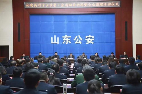 12月23日下午,由山东省人民政府、山东省公安厅、省慈善总会、省民政厅、省公安民警优抚基金会联合举办的"公安英烈子女录警·金盾助学助困暨企业捐赠活动仪式"在省公安厅正式启动,山东省副省长、公安厅厅长孙立成,省公安厅党委委员、副厅长闫希军,省民政厅党组成员、副厅长张魁中,省公安厅党委委员、政治部主任修春清,省烟草专卖局党组书记、局长吴洪田,省公务员局副局长于顺水,金天国际董事局主席祖明军,省公安民警优抚基金会理事长姜永梅等领导出席,各市公安局、各直属公安局、济南铁路公安局政治部、厅直各单位、2016新录公安英烈子女及家长、受助学生及民警代表共150人参加了本次仪式。