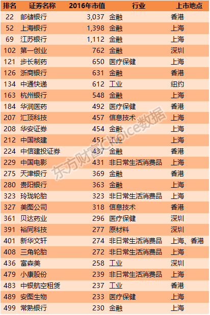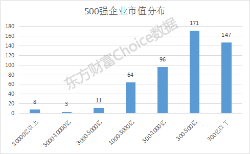 2016年市值500强公司的门槛是230亿元,其中8家市值超过1万亿元,86家市值超过1000亿元。大部分公司市值在230-500亿元之间。