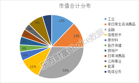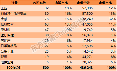 如果以市值计,500强公司的行业分布明显偏向金融业,它们以15%的数量贡献了32%的市值。