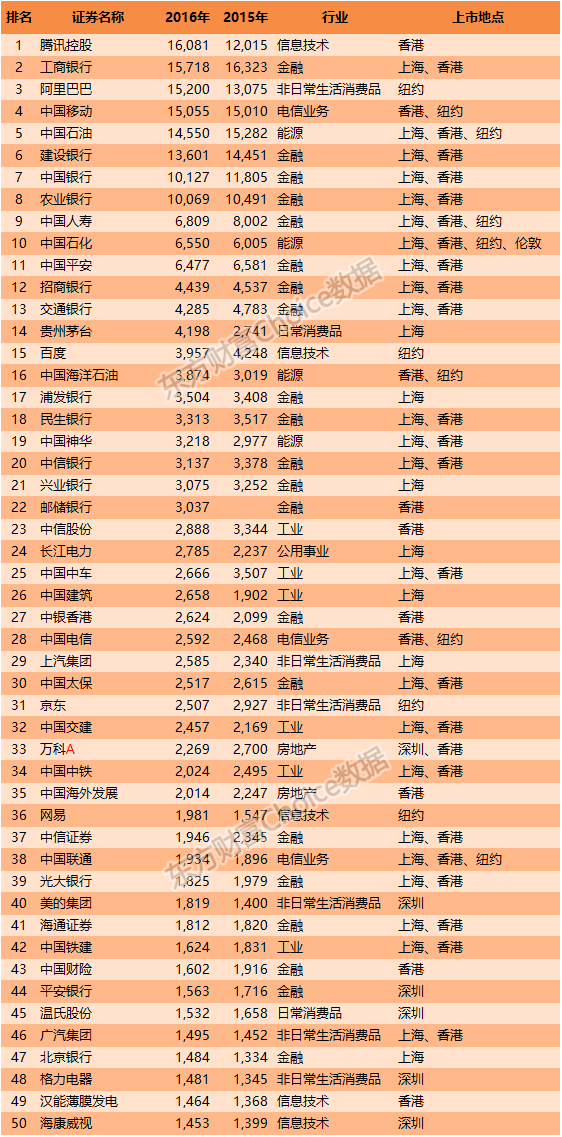 新出炉的东方财富Choice数据中国上市公司市值500强榜单显示,腾讯控股成为2016年市值最大的中国公司,市值高达16081亿元,市值超万亿的还有工商银行、阿里巴巴、中国移动、中国石油、建设银行、农业银行以及中国银行。值得注意的是在目前中医药产业发展迅猛的背景下,布局中医药全产业链的康美药业进入2016年中国上市公司市值百强,位列94位。